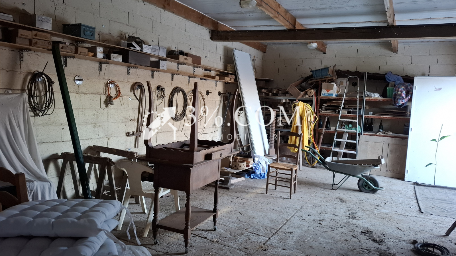 ***Rdc : salle d'env. 20 m², 1 pièce avec escalier et mezzanine + acces terrasse, ouverte sur cuisine aménagée ( prévoir quelques travaux). 1 pièce type buanderie + wc.