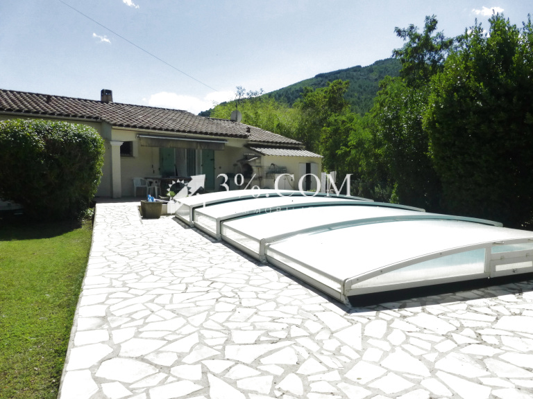 3%.COM – ALES - Ref 36722 – A vendre charmante maison de 2004, plain pied avec véranda, piscine, garage et abri bois sur la commune Le Martinet , à 22 kms d’Alès dans le Gard.