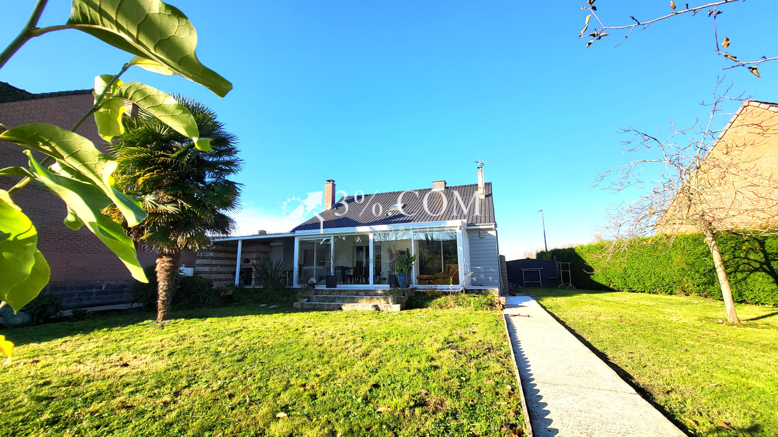 Rare flamande individuelle en semi plain-pied de 116 m² habitables bâtie sur 970 m² de terrain clos et arboré exposé Sud-Est.