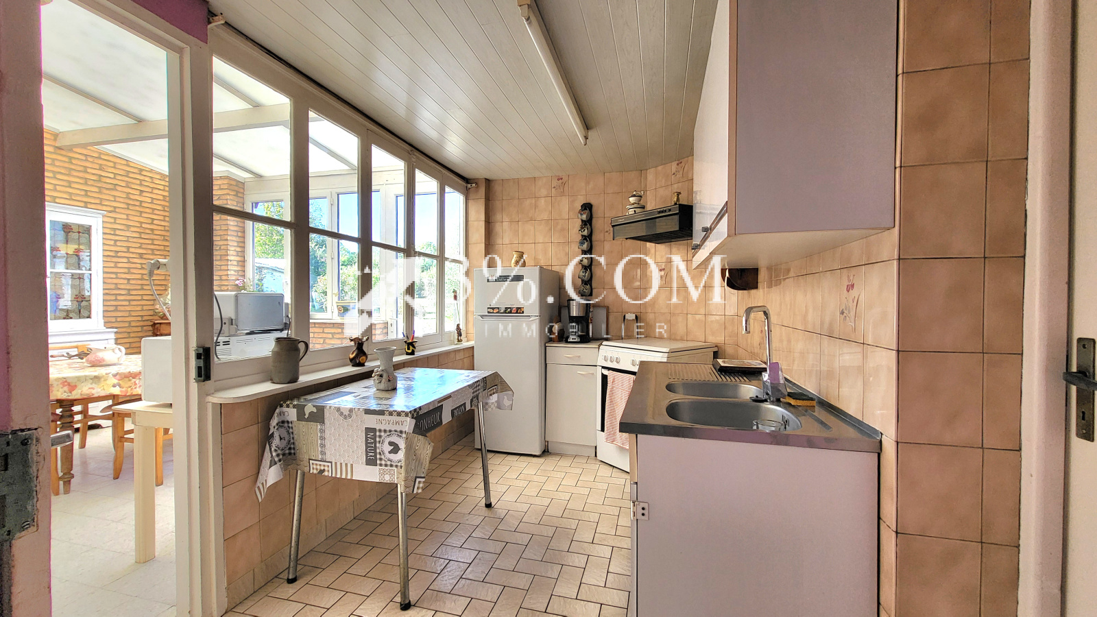 Hall d'entrée, séjour, cuisine, chambre et salle de bain au RDC, buanderie, véranda.