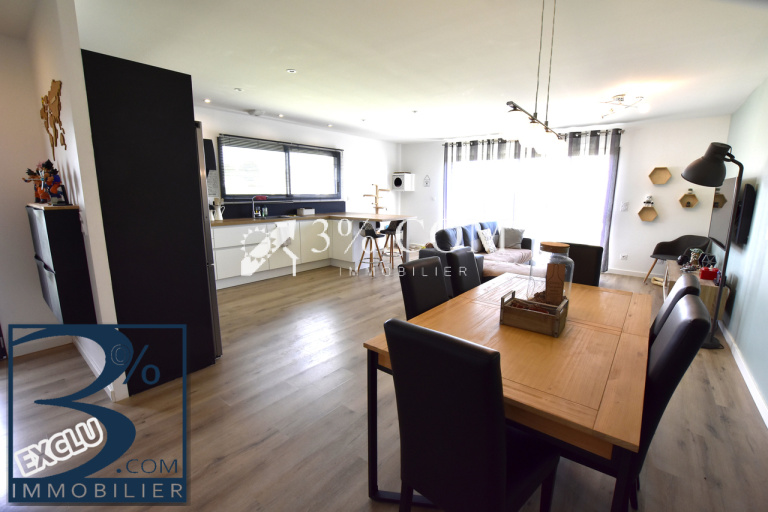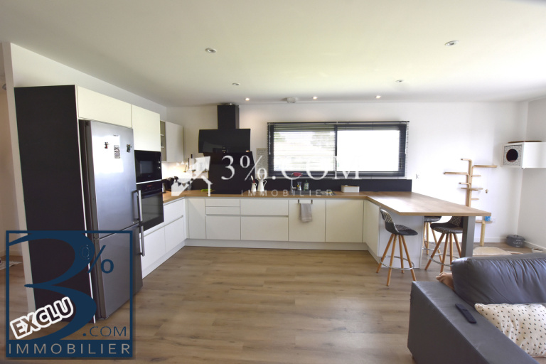 Exposé Sud, la cuisine équipée moderne ouverte sur le salon /séjour forme un ensemble spacieux et agréable de 46 m² ! Côté pratique un cellier / buanderie de 7 m² est accessible également par l’extérieur.