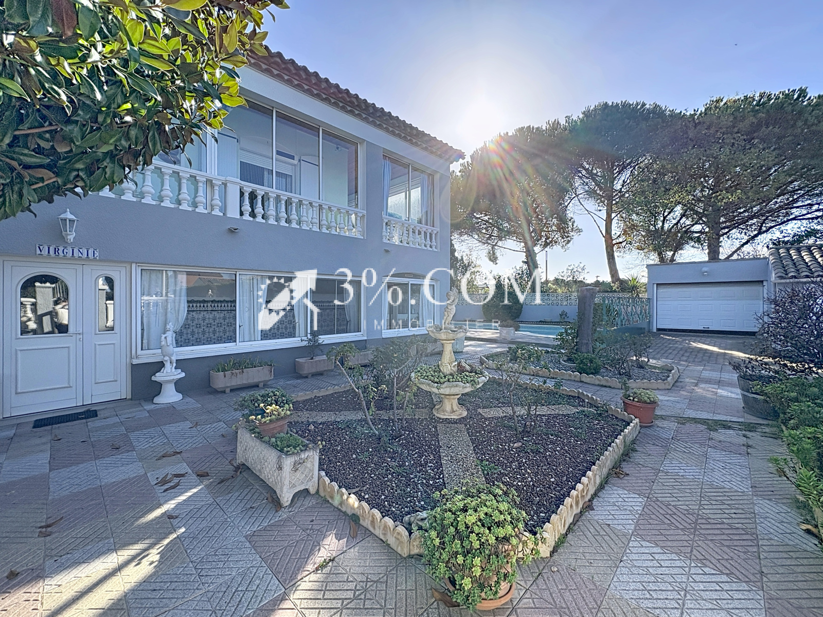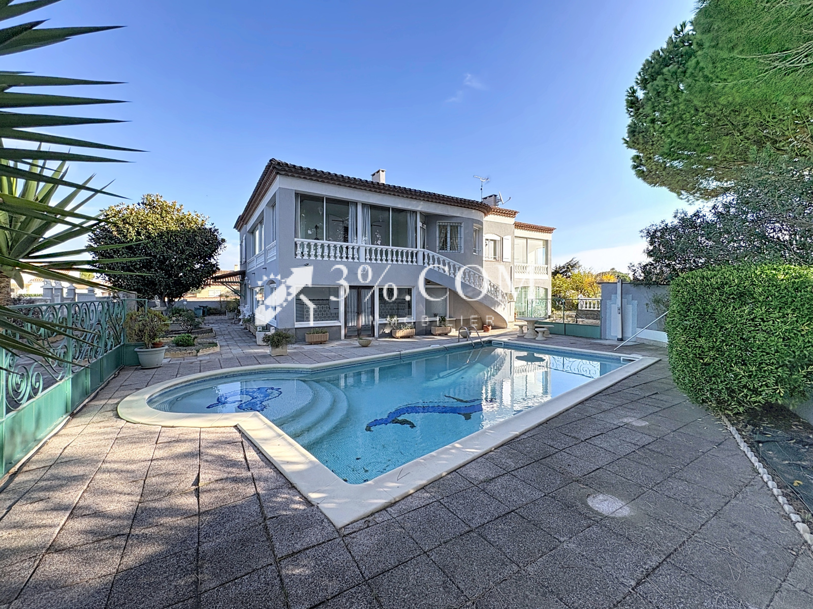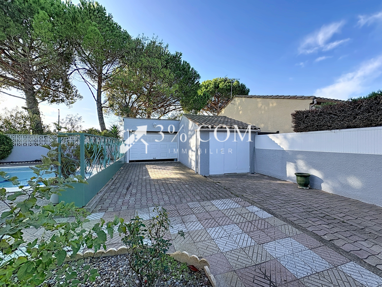 Édifiée sur un terrain arboré et clôturé de 1 088 m², elle dispose de trois garages, de quatre places de parking, d'un parking à proximité, d'une piscine, d'un portail électrique, et bénéficie d'un accès PMR.